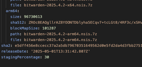 When checking updates using staged rollouts, electron-updater will use a random persistent per-installation GUID and derive a rollout percentage from it. It will then refuse to apply any